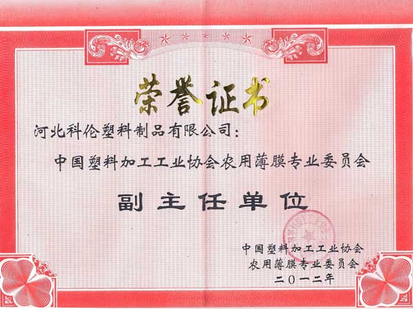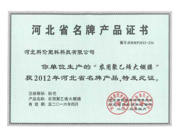 Over the years, the Company has always been sticking to the purpose of "meeting the users' demand to the maximum" and abiding by the brand concept of "Relying on quality and technology to improve brand value, and creating a Chinese well-known trademark”. It has successively established a long-term technical cooperative relationship with many R&D institutions, including Beijing Chemical Industry Research Institute, China Agricultural University, etc. The product quality keeps improving and the marketing network spreads all over the country. The Company and its products have successively won the “Stable Qualified Products in National Quality Inspection”, “Hebei Famous Products”, “Hebei High-quality Products”, “Hebei Consumer Trustworthy Products”, “Hebei Light Industry Excellent Enterprise”, “Handan Agricultural Industrialization Leading Enterprise”, “Quality and Reputation Demonstration Unit in Chinese Light Industry”, “Hebei Consumer Trustworthy Unit” and other honorary titles, and the product trademark “Kelun” was appraised as “Hebei Famous Trademark” and “Hebei Best Seller in Light Industry”. Besides, the Company also is a member unit of CPPIA, and the vice president unit of the “Agricultural Film Sub-Committee of CPPIA”, enjoying pivotal status in national agricultural plastic film industry.